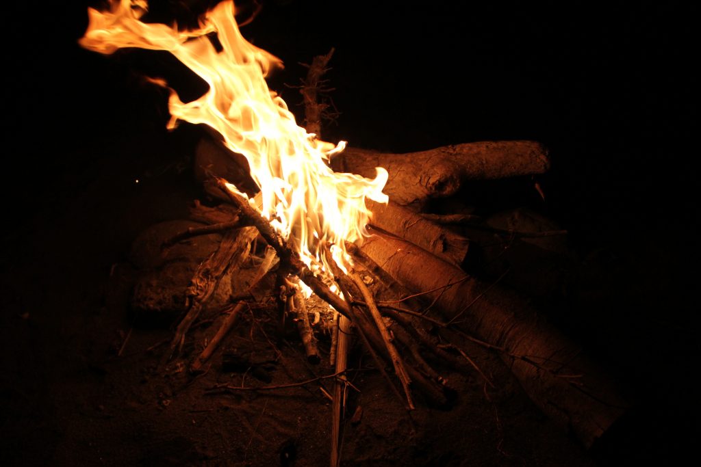 辺りがどっぷり暗闇に包まれた頃、ガスバーナーで枯れ木に着火します。