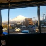 電車に乗ってしばらくすると、朝日にきらめく富士山が見えました。
