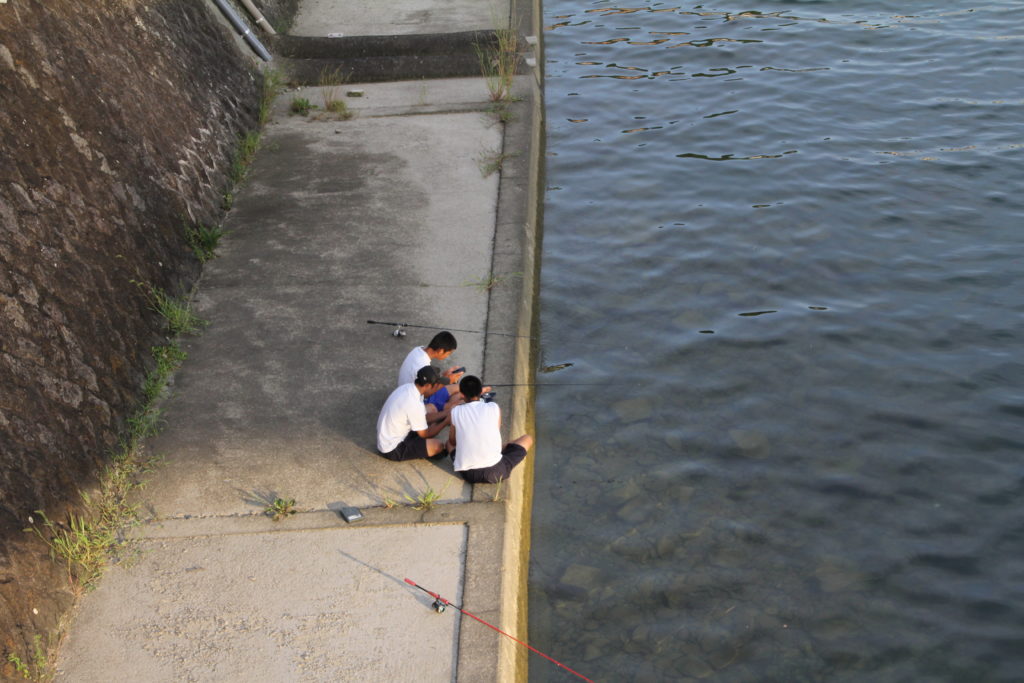 そこには釣り糸を垂れながら、スマホか何かで遊ぶ学生たちの姿が。